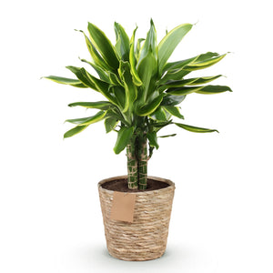 Dracaena fragrans Golden Coast is een prachtige kamerplant die zowel een vleugje elegantie als een natuurlijke uitstraling in uw interieur brengt. Deze plant heeft opvallende stengels die een rijke, groene kleur hebben met een gouden tint, wat zorgt voor een levendig contrast. De bladeren zijn smal en lancetvormig, met een lichte gele rand die de plant een frisse en levendige uitstraling geeft.