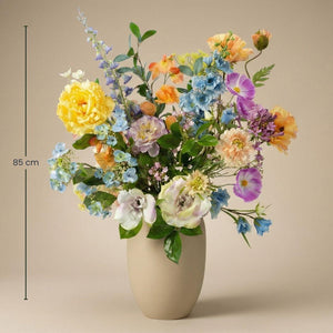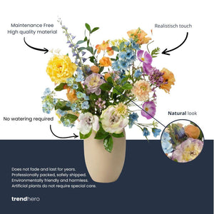 Dit vrolijke arrangement combineert pastelgeel, hemelsblauw, zacht lila, perzikkleuren en romig wit tot een levendige maar verfijnde compositie. De natuurlijk ogende bloemblaadjes en realistisch bladwerk geven het een vers geplukte uitstraling, zonder te verwelken. Met een hoogte van ca. 85 cm en 18 zorgvuldig geplaatste stelen voegt dit boeket een warme, opbeurende sfeer toe aan elke ruimte. Perfect voor hal, woonkamer, werkplek of winkelinterieur – het straalt het hele jaar door blijvende schoonheid uit.
