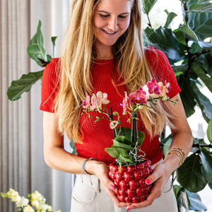 Breng wat kleur in je interieur met deze prachtige rode orchidee in een opvallende Berry sierpot. Met 2 of 3 takken zorgt deze orchidee voor een echte eyecatcher in elke ruimte. De pot, gemaakt van keramiek, heeft een potmaat van 9 en heeft een glanzende afwerking. Voeg een vleugje frisheid toe aan je huis met deze mooie combinatie van plant en pot.