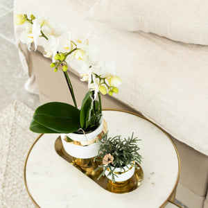 Deze mooie Amabilis orchidee glinstert in de gouden Le Chic pot. De orchidee heeft egaal witte bloemen en geeft 2 tot 3 stevige takken. De orchidee is gecombineerd met de Le chic pot goud, deze sierpot ga je veel terug zien komen in wooninterieurs. De pot is wit en kun je herkennen aan de gouden details. De pot heeft een gladde afwerking en heeft een potmaat van 9cm. Het maakt de glamour en elegante stijl helemaal af.