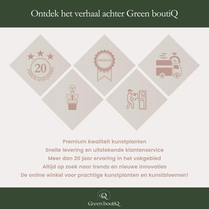 De kunstbloemen van Green boutiQ verzekeren jou van hoge kwaliteit. Dat betekent dat ze er ook over een aantal jaar nog schitterend uitzien. Er is helemaal geen onderhoud nodig, wat veel gemak biedt. Door de realistische uitstraling zijn de bloemen niet van echt te onderscheiden. Je kunt het hele jaar door genieten van de kunstbloemen, welk seizoen het ook is. Combineer het boeket met een van onze mooie vazen voor de perfecte finishing touch. Wacht niet langer en verrijk je interieur met onze kunstbloemen!