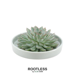 ROOTLESS succulents worden geteeld in een kweekpot en groeien tot het juiste formaat. Als het rozet van de plant groot genoeg is, dan wordt deze losgesneden van de potgrond. Een ROOTLESS kan een Echeveria, Aloe en Gasteria zijn. Andere namen voor ROOTLESS zijn snijvetplant, snijplant, snij-echeveria en snijsucculent.