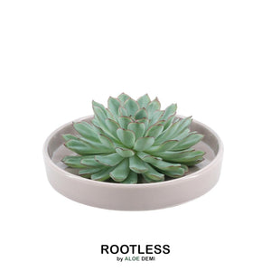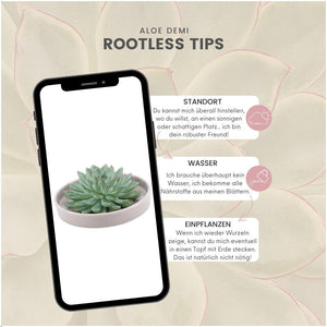 ROOTLESS succulents worden geteeld in een kweekpot en groeien tot het juiste formaat. Als het rozet van de plant groot genoeg is, dan wordt deze losgesneden van de potgrond. Een ROOTLESS kan een Echeveria, Aloe en Gasteria zijn. Andere namen voor ROOTLESS zijn snijvetplant, snijplant, snij-echeveria en snijsucculent.