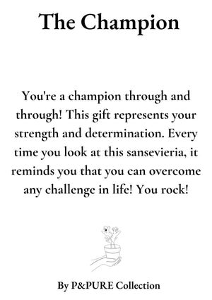 - Deze Sansevieria wordt gepresenteerd als een stijlvol groen geschenk, inclusief een kaart met de inspirerende tekst "The Champion".